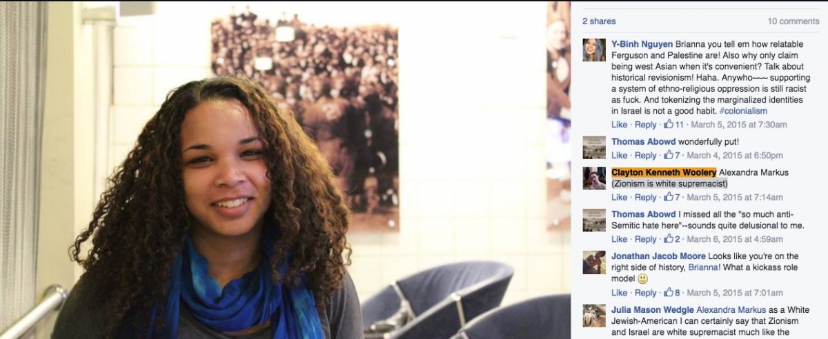 On March 3, 2014, Woolery shared a Tufts Daily op-ed by Tufts SJP leader Leah Muskin-Pierret, who claimed that Israel’s history bears a “glaring resemblance to the history of genocide, settler-colonialism and anti-Indigenous racism that the U.S. is built upon.” Muskin-Pierret claimed that Palestinians are forced into “reservation-like population centers” and that Israel has engaged in “ethnic cleansing.”