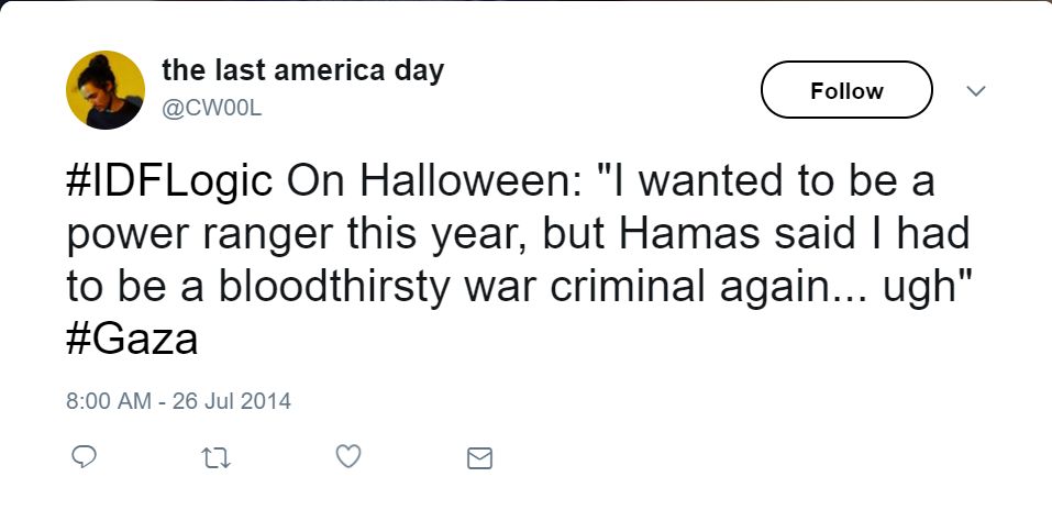 On July 26, 2014 — shortly after Hamas fired a rocket at Israel’s Ben Gurion Airport — Woolery tweeted: "#IDFLogic ‘Its sooo annoying to not have access to an airport!’ *ignores the fact that #Gaza doesn't even have room for one* #BenGurion.”On the same day, Woolery tweeted: “#IDFLogic On Halloween: ‘I wanted to be a power ranger this year, but Hamas said I had to be a bloodthirsty war criminal again... ugh’ #Gaza.”
