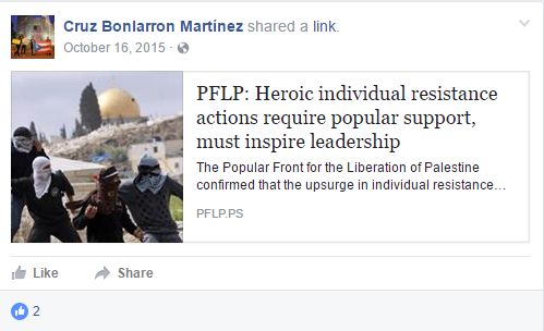 On October 16, 2015, Martinez shared an article on Facebook published by the Popular Front for the Liberation of Palestine (PFLP), a terrorist organization. The article, titled “PFLP: Heroic individual resistance actions require popular support, must inspire leadership,” called for an escalation of “resistance with knives.”In October 2015, there was an upsurge in violence across Israel incited by Palestinian political and religious leaders. The wave of stabbings, known as the “Knife Intifada,” was characterized by young Palestinians throughout the country stabbing and attempting to stab Israeli civilians. The attacks were incited by Palestinian leaders propagating the libel that Israel intended to desecrate the Al-Aqsa Mosque in Jerusalem.