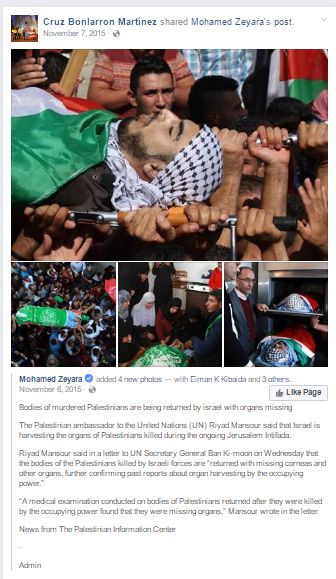 On November 7, 2015, Martinez shared an article on Facebook claiming that “Bodies of murdered Palestinians are being returned by israel with organs missing.” The post also accused Israel of “harvesting the organs of Palestinians killed during the ongoing Jerusalem Intifada.”