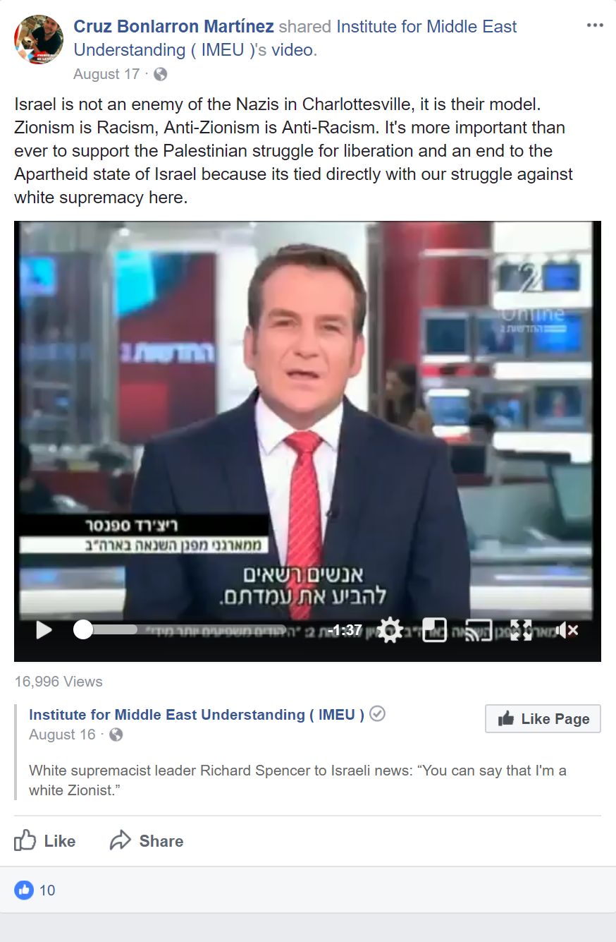 On August 17, 2017, Martinez posted on Facebook: “Israel is not an enemy of the Nazis in Charlottesville, it is their model.”He also added: “Zionism is Racism, Anti-Zionism is Anti-Racism” and called for “an end to the Apartheid state of Israel.”