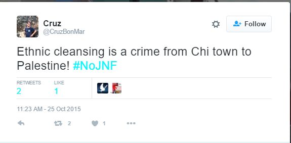 On October 25, 2015, Martinez tweeted: “Ethnic cleansing is a crime from Chi town to Palestine! #NoJNF.”