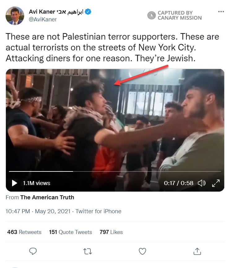 Cione helped direct [00:00:17] a mob of rioters who attacked and spat on Jewish diners as well as [00:05:53] a mob that attempted to breach a police barrier during a violent counterprotest. He also fled [00:09:38] with other rioters and he evaded the police when officers arrested activists who failed to disperse after the New York Police Department (NYPD) declared the assembly unlawful.When Cione helped direct [00:00:17] a mob who attacked and spat on Jewish diners at an outdoor restaurant, he could be seen in a Twitter video at the center of the screen, facing away from the camera. He wore a black short-sleeved t-shirt and a black and white-patterned keffiyeh wrapped around his neck. The Twitter video of the attack was posted on May 20, 2021.