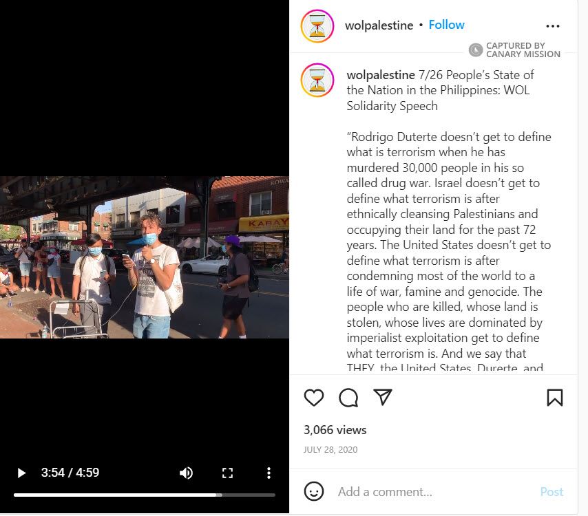 At a July 2020 rally in Queens, New York, Cione addressed a crowd as a WOL representative. He shouted into a microphone [00:00:01]: “From Palestine to the Philippines, stop the U.S. war machine!...”Cione later said [00:02:44]: “Israel doesn’t get to define what is terrorism after ethnically hunting Palestinians and occupying their land for over 72 years. The United States doesn’t get to define what is terrorism after condemning most of the world to a life of war, famine, genocide. The people who are killed… whose lives are dominated by imperialist exploitation get to define what terrorism is. And they say the United States… and Zionism are the real terrorists…”