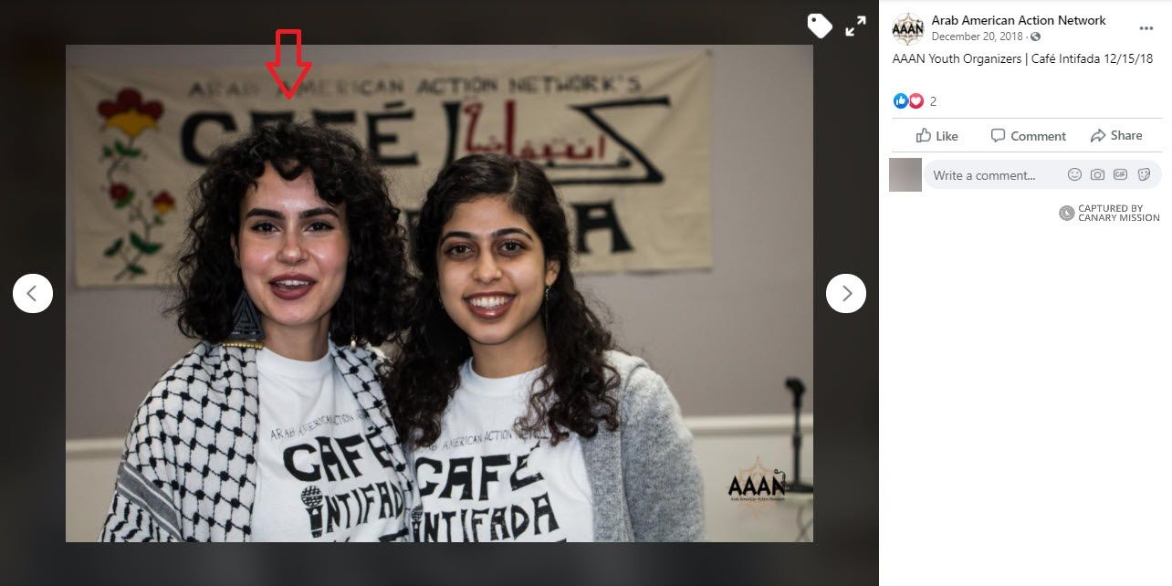 On January 1, 2019, Zituni posted to Facebook a photo of herself in front of a pillar in the AAAN building that showed a painting of Kanafani. She wrote: “To another year of doing what I love: working-class Arab organizing & Arab art & more with my Arab American Action Network fam