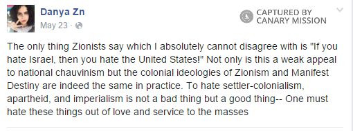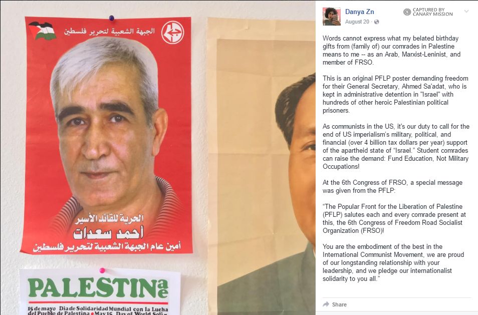 On August 20, 2016, Zituni posted posted to Facebook pictures of Chinese dictator, Chairman Mao and PFLP General Secretary, Ahmed Sa'adat and wrote: “As communists in the US, it's our duty to call for the end of US imperialism's military, political, and financial (over 4 billion tax dollars per year) support of the apartheid state of Israel. Student comrades can raise the demand: Fund Education, Not Military Occupations!”