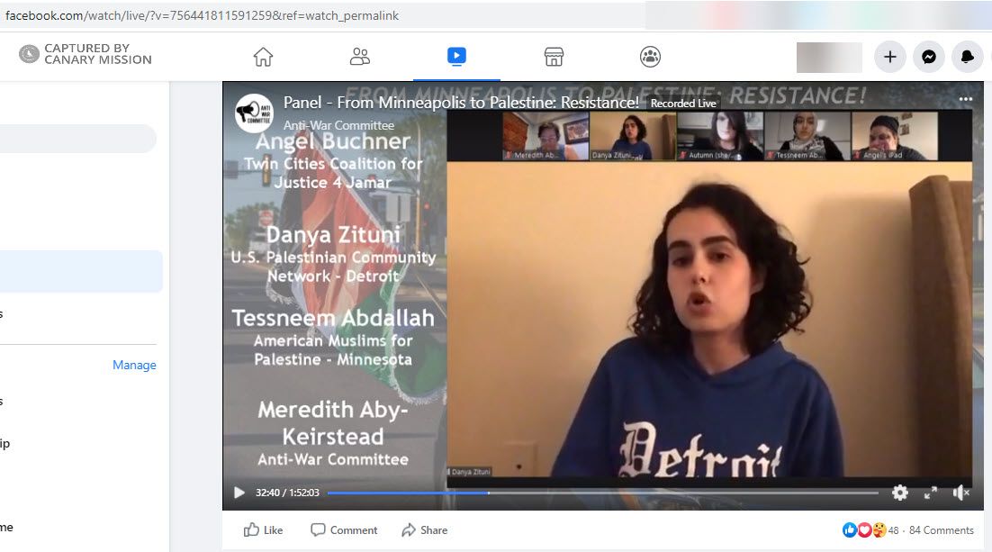 On July 23, 2020, Zituni spoke [00:29:37] in an Anti-War Committee panel, titled, “From Minneapolis To Palestine: Resistance!” where she said [00:29:55]: “The Palestinian liberation movement is part and parcel of the global movement against the system of U.S. imperialism… The Palestinian movement in the U.S. must unconditionally support the number one threat to U.S. imperialism internally, which is the Black Liberation Movement.”
