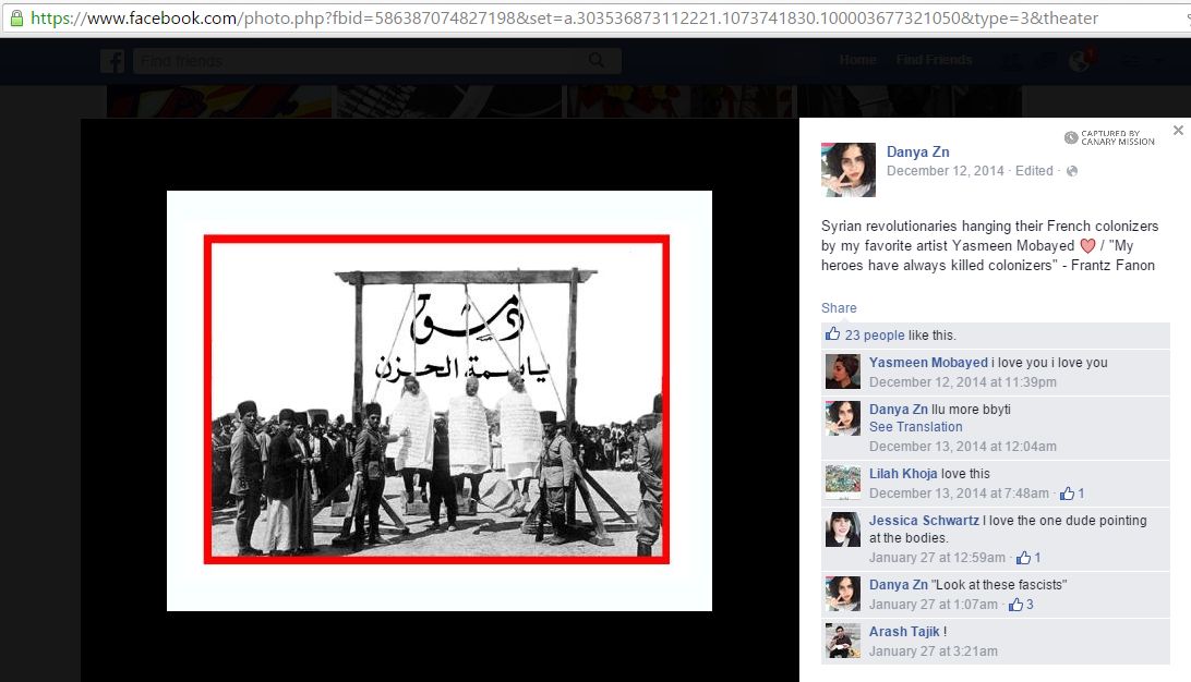 On December 12, 2014, Zituni posted to Facebook an image of three men being hanged. She wrote: “Syrian revolutionaries hanging their French colonizers by my favorite artist Yasmeen Mobayed