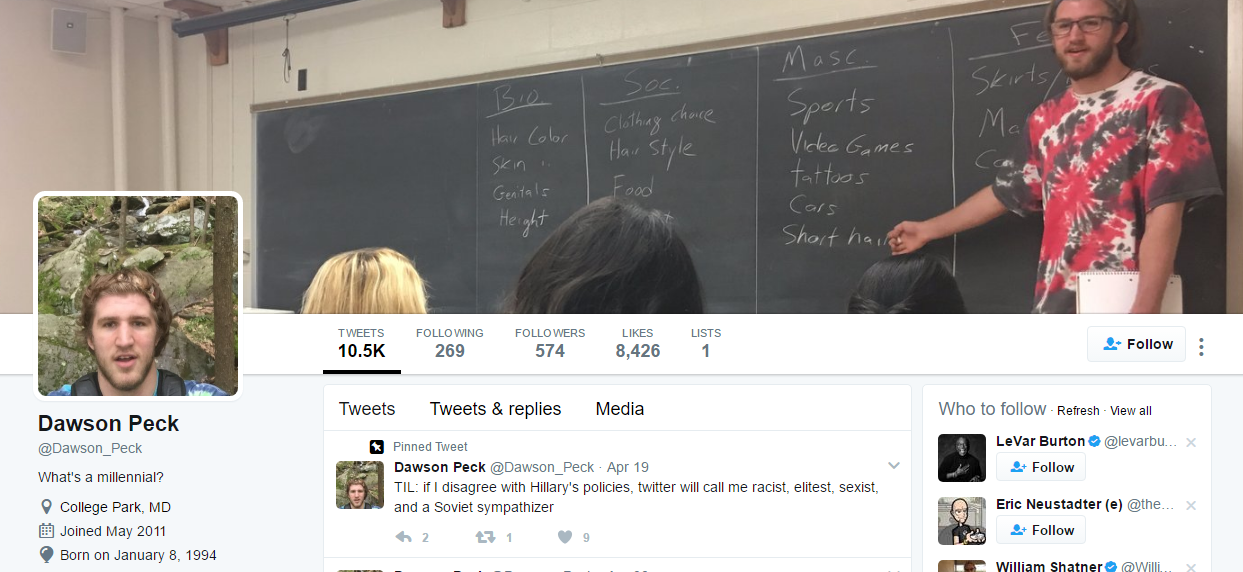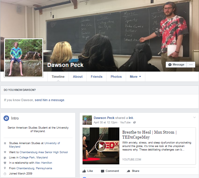On his LinkedIn page, as of May 2017, Peck claimed to be an Educational Assistant at UMD. Peck also claimed that he taught an American Studies 101 class on an introduction to Gender Theory, in November of 2016.