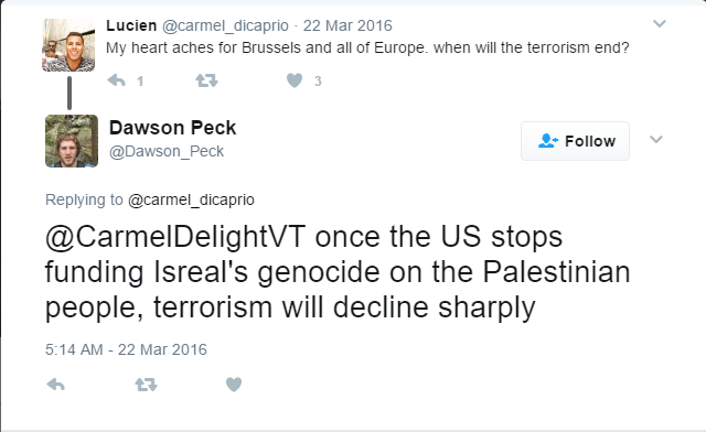 On March 22, 2016, Peck tweeted: “once the US stops funding Isreal's genocide on the Palestinian people, terrorism will decline sharply.”His tweet was in response to another tweet asking “when will the terrorism end?” about ISIS terror attacks in Brussels earlier that day.