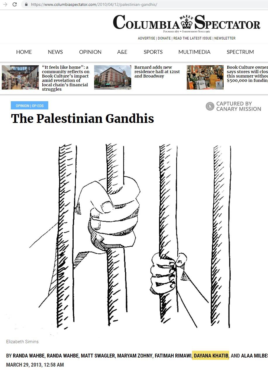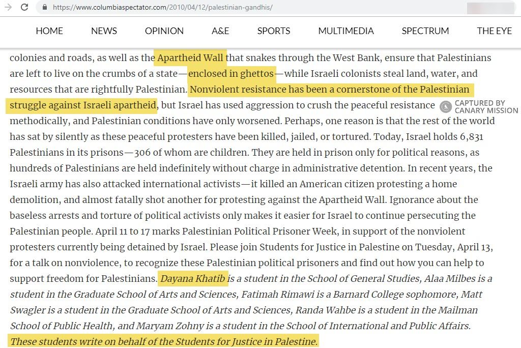 Khatib co-authored an article, originally published on March 2, 2013, updated on March 27, 2013, in the Columbia Daily Spectator on behalf of SJP, titled: “Israel, peace not apartheid,” explaining why Israeli Apartheid Week members chose to erect a wall on campus “rather than engage in dialogue toward ‘peace.’"