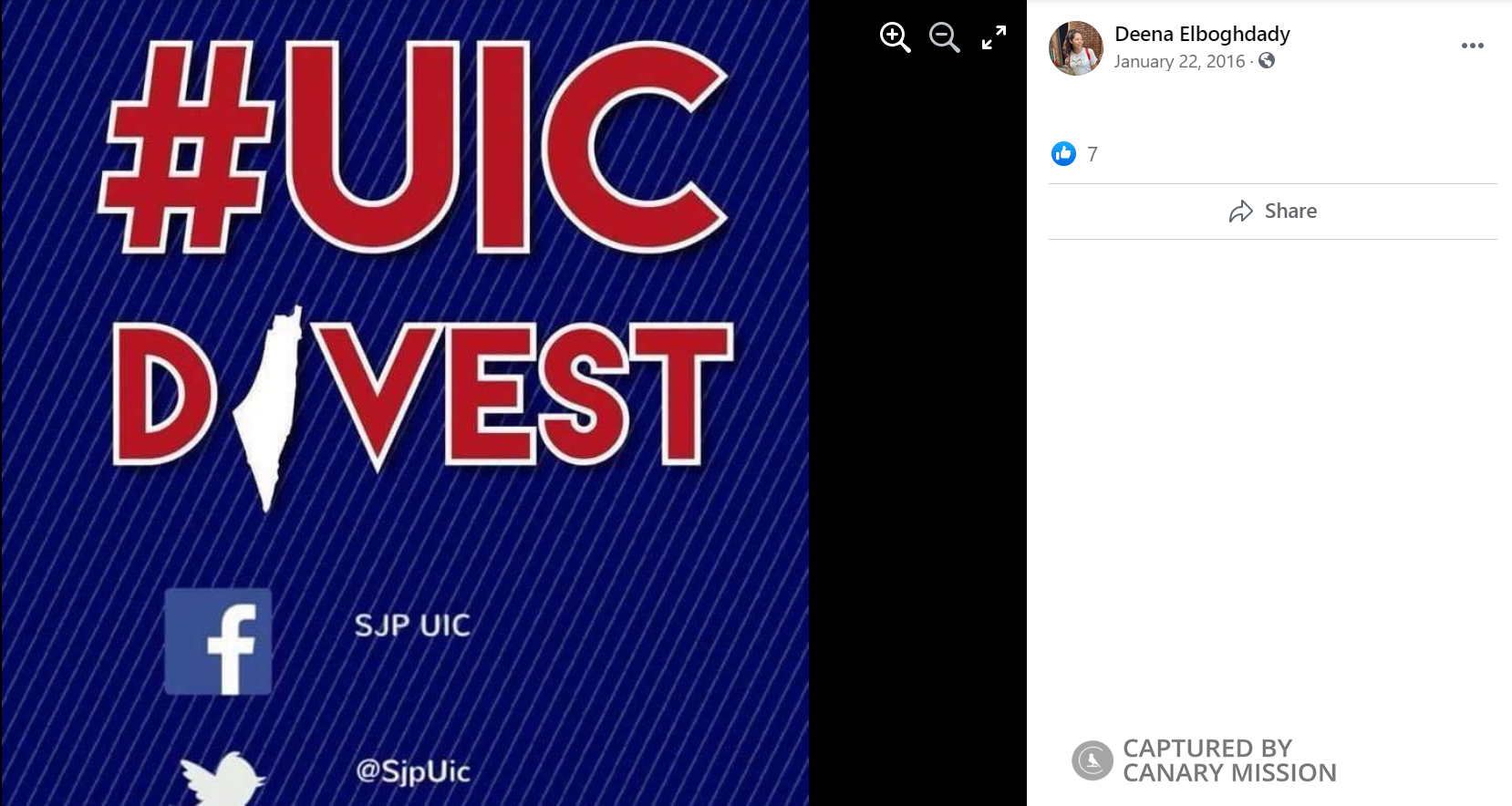 On January 22, 2016, Elboghdady promoted SJP UIC’s UIC Divest campaign on her Facebook page. In January 2016, SJP UIC launched UIC Divest, a campaign calling for UIC “to divest from companies that support the illegal occupation of Palestine such as G4S, Caterpillar, Hewlett Packard and Boeing.In February 2016, SJP UIC united with 23 other student groups to co-sponsor a BDS resolution that proposed “divestment from companies profiting from human rights abuses and violations of international law in Palestine.”