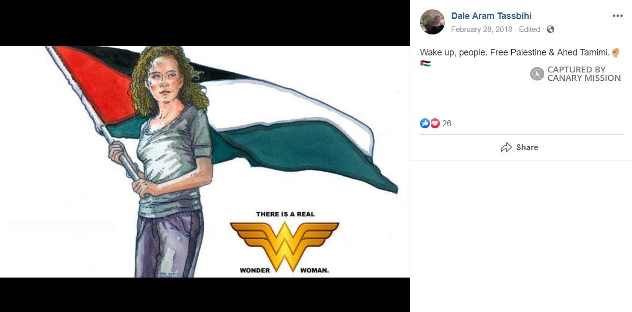 On February 28, 2018, Tassbihi wrote on Facebook: “Wake up, people. Free Palestine & Ahed Tamimi.✊🏽🇵🇸” The post included a graphic featuring Ahed Tamimi holding a Palestinian flag with a caption that read: “THERE IS A REAL WONDER WOMAN.”On January 16, 2018, Tassbihi tweeted: “My fam in Iran thinks I’m the laziest s**t ever bc I sleep in and nap sooo much (I can’t deny the truth), but they don’t know I am reading current event articles for 2-3 hrs once everyone’s asleep and crying myself to sleep bc the world is f**ked!!!!! S**thole!!! #ahedtamimi.”