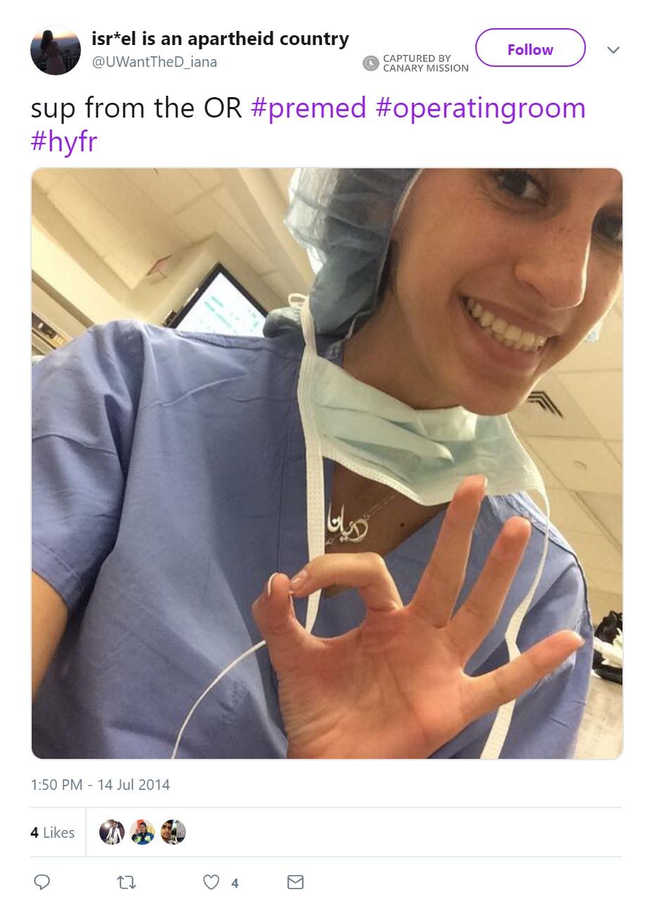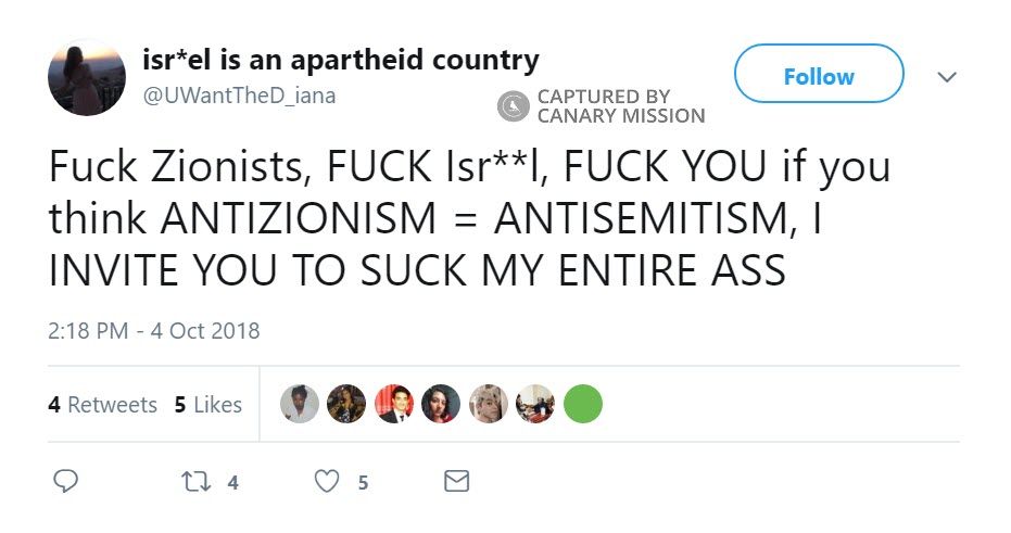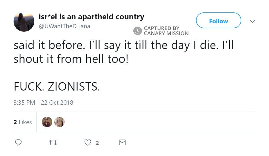 On April 11, 2016, Nabulsi tweeted: “f**k Zionism.”