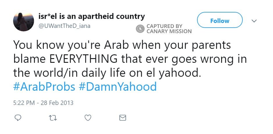 On February 28, 2013, Nabulsi tweeted: “You know you're Arab when your parents blame EVERYTHING that ever goes wrong in the world/in daily life on el yahood [the Jews]. #ArabProbs #DamnYahood [#DamnJews].”