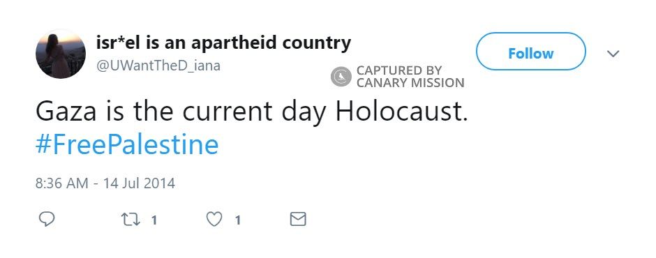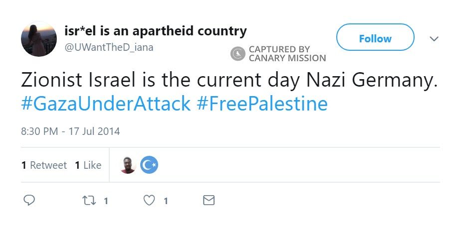 On July 17, 2014, during Israel’s Operation Protective Edge (OPE), Nabulsi tweeted: “Zionist Israel is the current day Nazi Germany. #GazaUnderAttack #FreePalestine.”