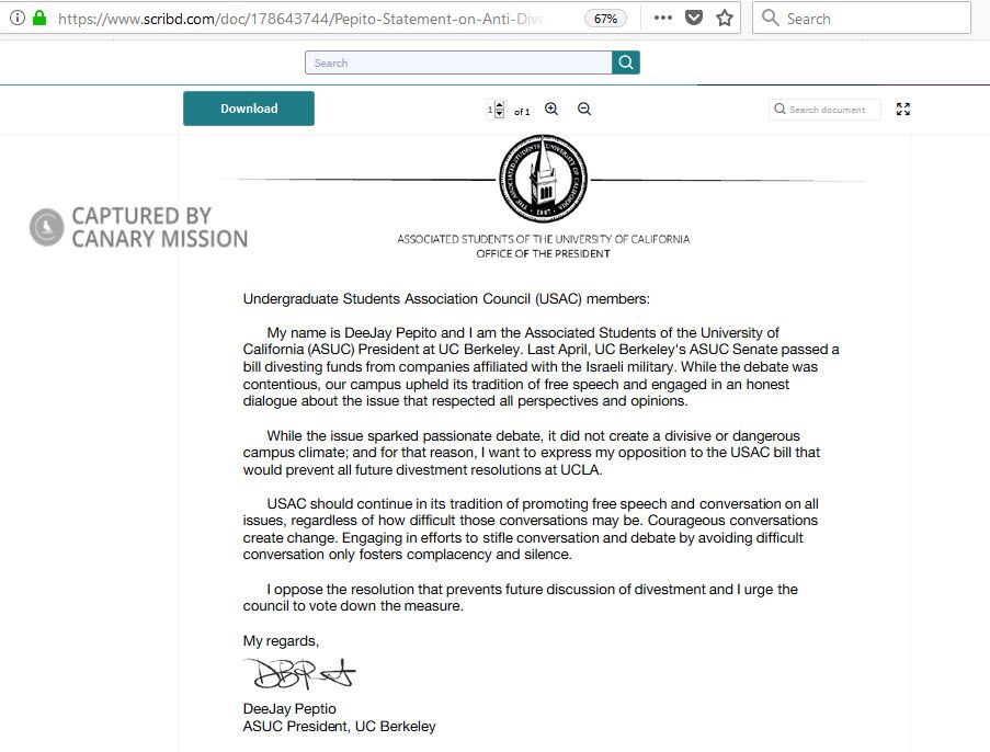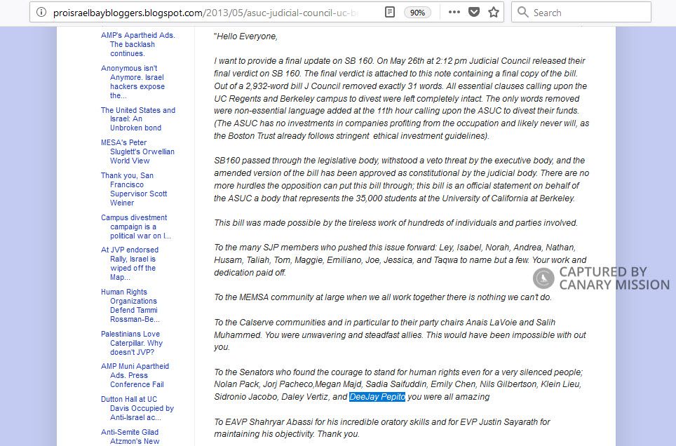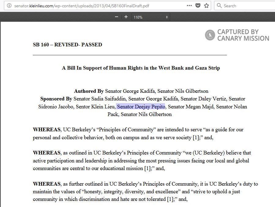 Donna-Jo Pepito [DeeJay Pepito] co-sponsored an anti-Israel Boycott, Divestment, Sanctions (BDS) movement resolution at the University of California Berkeley (UC Berkeley) in April 2013.Pepito was acting in her capacity as a student senator of the Associated Students of the University of California (ASUC). She later became president of the ASUC in June 2013.