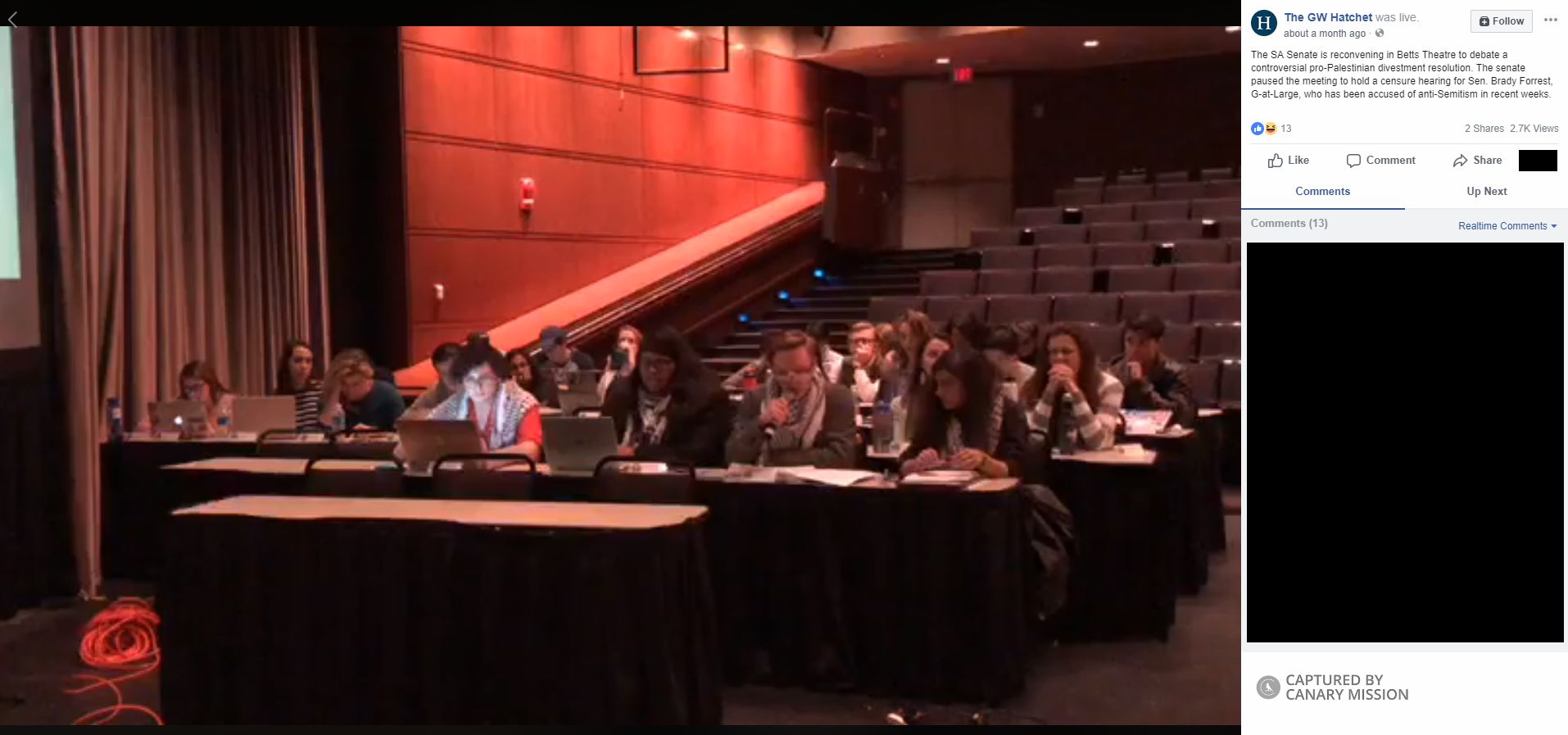 On March 24, 2018, student groups at GWU launched the second BDS campaign in two years; both were titled “#DivestThisTime.” Activists with Students for Justice in Palestine (SJP) at GWU (SJP at GWU) led both campaigns.On the campaign launch day, #DivestThisTime released a Facebook promotional video, in which activists alleged [00:01:23] that Israel has committed “crimes against humanity.” They also claimed [00:03:34] that Palestinians are “bombed every day” and blamed Israel [00:02:06] for police violence against black Americans in Ferguson, Missouri.