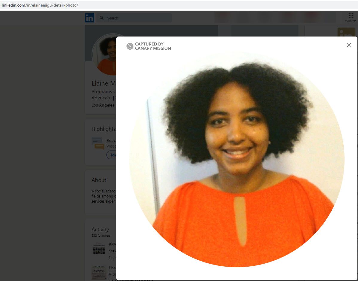As of June 2021, Ejigu’s LinkedIn page said she had been the “Co-Signer (Co-Chair)” of the Committee for Justice in Palestine (CJP) at UCSC from April 2013 to June 2014. UCSC CJP was renamed UCSC Students for Justice in Palestine (SJP) in October 2014.
