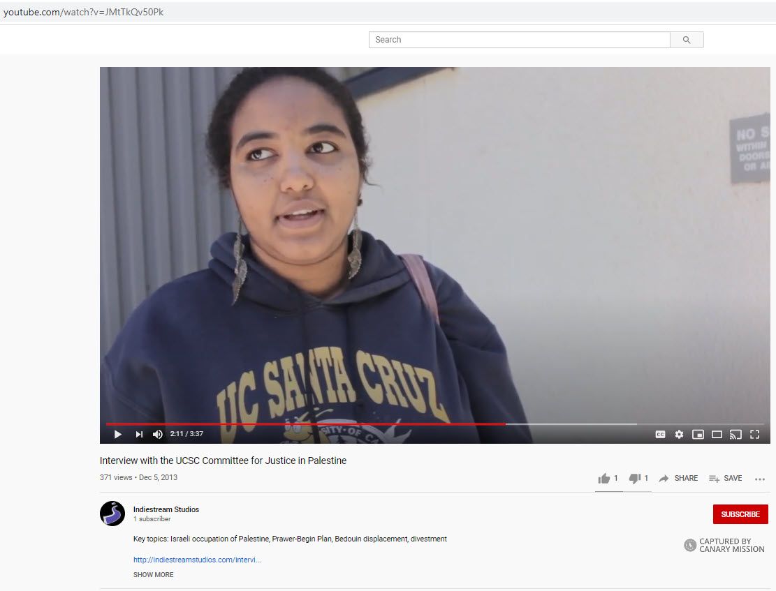 Ejigu co-facilitated an anti-Israel BDS campaign at the University of California, Santa Cruz (UCSC) in 2014.