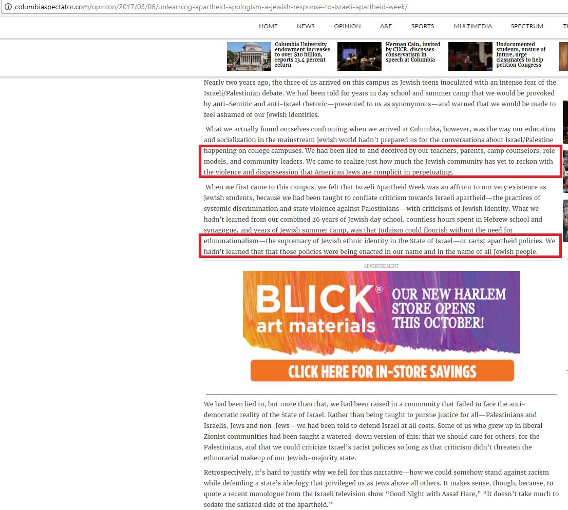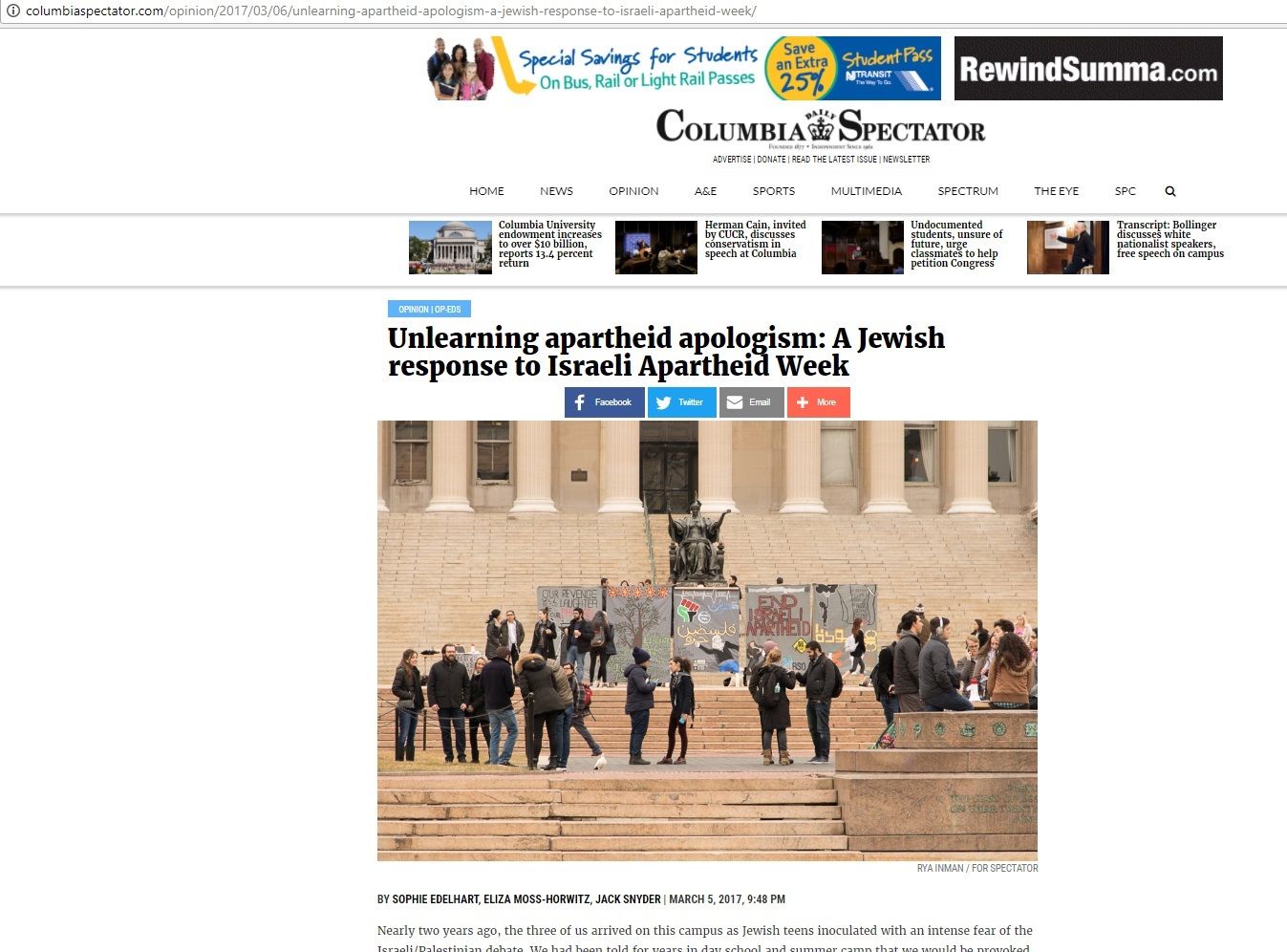 On March 5, 2017, Moss-Horwitz co-authored an opinion piece for The Columbia Spectator titled, “Unlearning apartheid apologism: A Jewish response to Israeli Apartheid Week.”In the op-ed, the authors argued that Jews on campus “had been lied to and deceived by [their] teachers, parents, camp counselors, role models, and community leaders.”