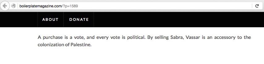 In February 2016, SJP Vassar announced that they would be selling "sweet fucking antiZionist gear" at their future events, such as a T-shirt featuring gun-toting terrorist Leila Khaled.