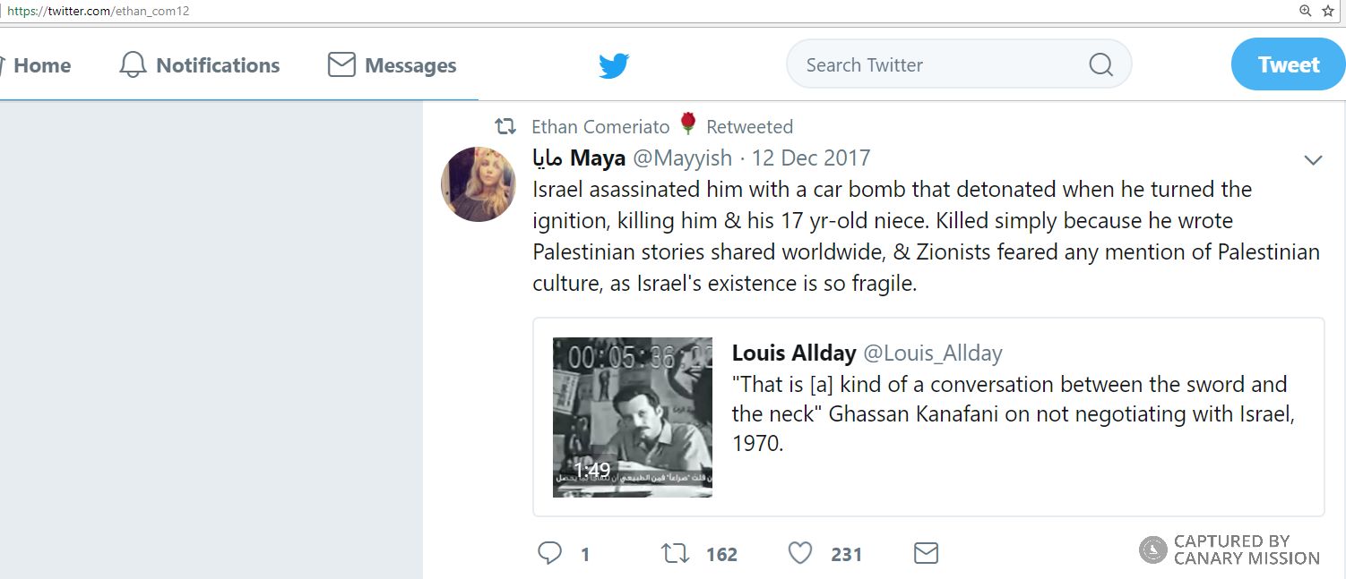 Comeriato retweeted a December 12, 2017 tweet featuring a video of terrorist Ghassan Kanafani rejecting negotiations as a path to peace.The tweet, written by terror-supporter Maya Cheatani, claimed that Kanafani was “Killed simply because he wrote Palestinian stories shared worldwide, & Zionists feared any mention of Palestinian culture, as Israel's existence is so fragile.”