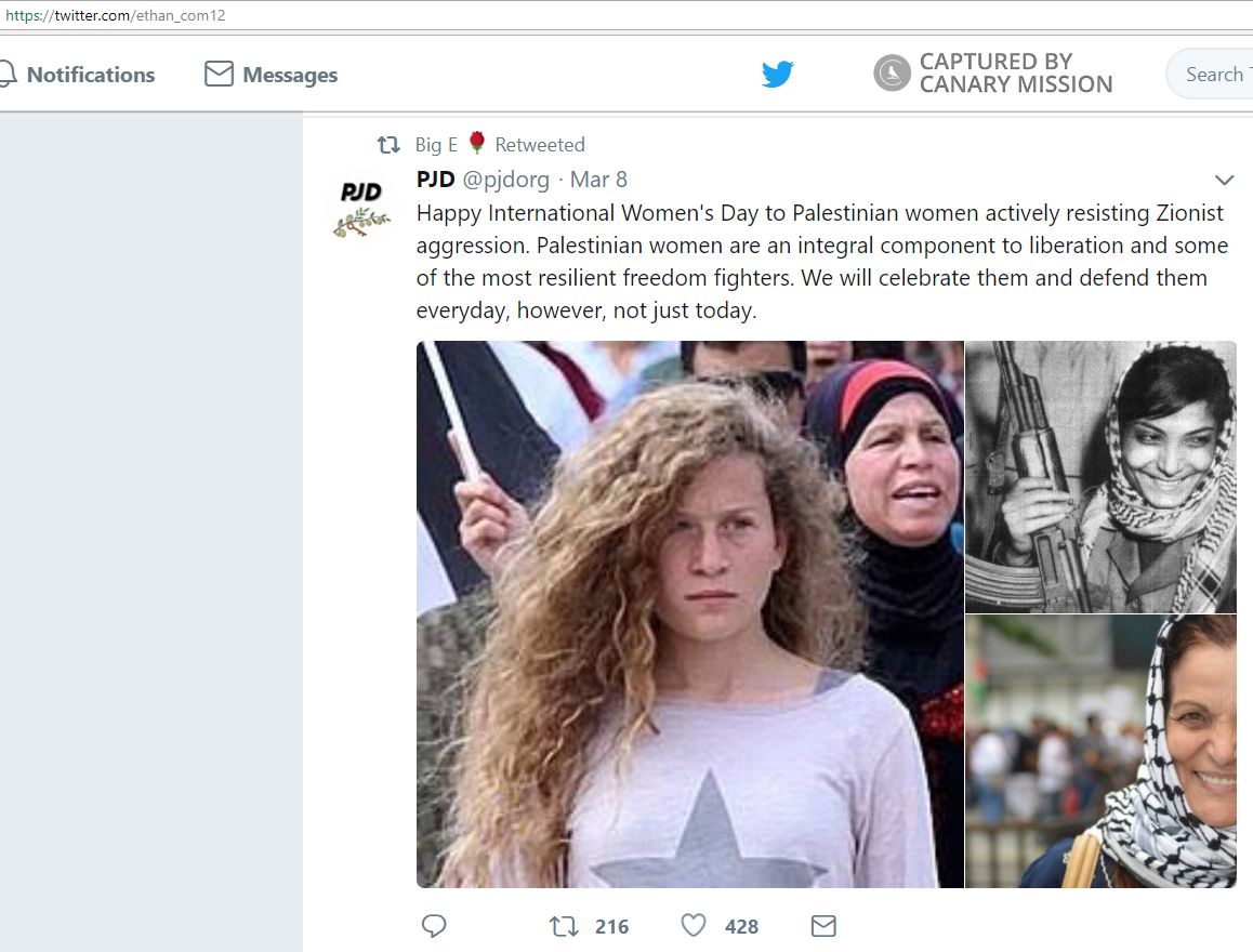 Comeriato retweeted a March 8, 2018 tweet honoring PFLP terrorists Leila Khaled and Rasmea Odeh, calling them “resilient freedom fighters.”