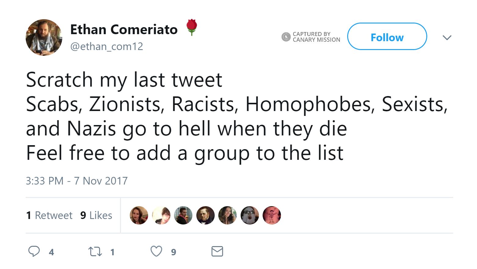 On November 7, 2017, Comeriato tweeted: “Scabs, Zionists, Racists, Homophobes, Sexists, and Nazis go to hell when they die.”