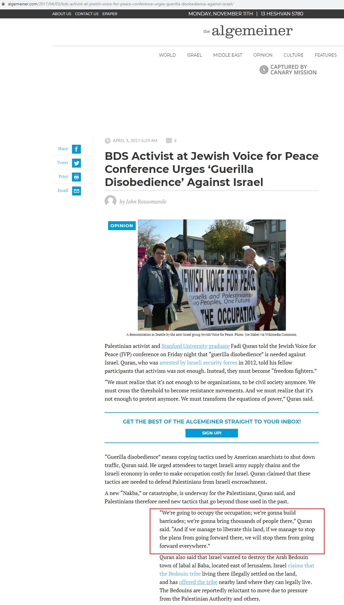 On February 9, 2015, Quran promoted on Facebook a BDS resolution that called on Stanford to divest from companies “Maintaining the illegal infrastructure of the Israeli occupation.”