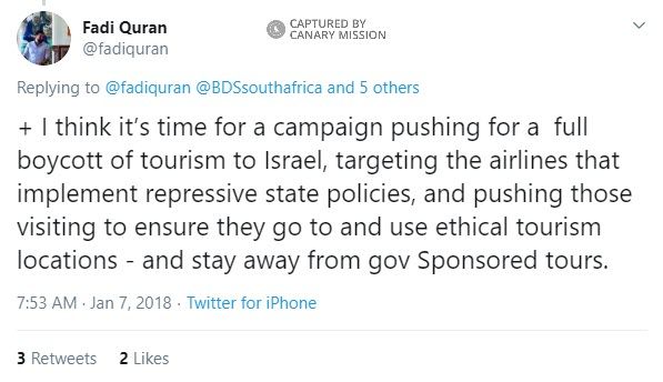 On January 7, 2018, Quran tweeted: “+ I think it’s time for a campaign pushing for afull boycott of tourism to Israel, targeting the airlines that implement repressive state policies, and pushing those visiting to ensure they go to and use ethical tourism locations - and stay away from gov Sponsored tours.”