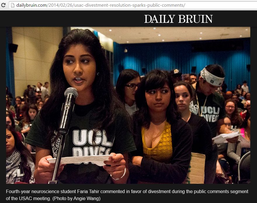 On February 25, 2014, Tahir spoke in support of an SJP at UCLA divestment resolution at an Undergraduate Students Association Council (USAC) meeting to vote on the resolution.The resolution reportedly called on UCLA to divest from companies that it claimed “violate Palestinian human rights by indirectly contributing to violent acts that are committed against Palestinians, preventing them from owning property and infringing upon their privacy, among other violations.”