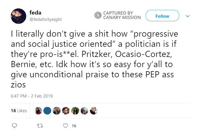 On February 2, 2019, Taha tweeted: “I literally don’t give a sh** how ‘progressive and social justice oriented’ a politician is if they’re pro-is**el. Pritzker, Ocasio-Cortez, Bernie, etc. Idk how it’s so easy for y’all to give unconditional praise to these PEP a** zios.”