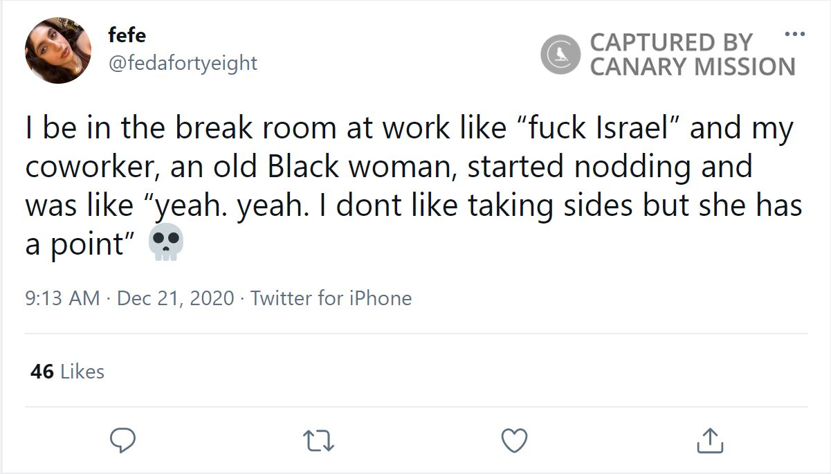 On December 21, 2020, Taha tweeted: “I be in the break room at work like ‘f**k Israel’ and my coworker, an old Black woman, started nodding and was like ‘yeah. yeah. I dont like taking sides but she has a point’
