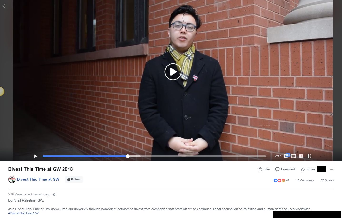 On March 29, 2017, Fritz shared a photo from the #DivestThisTime Facebook page from the kickoff event of Palestine Awareness Week (PAW), which was organized by SJP at GWU.