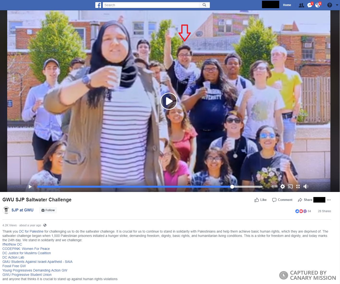 On May 12, 2017, Maryam Alhassani — led SJP at GWU student activists in a “Saltwater Challenge,” in solidarity with Palestinian prisoners then hunger striking in Israeli prisons.SJP at GWU - Hosting Right to Education Tour 2016