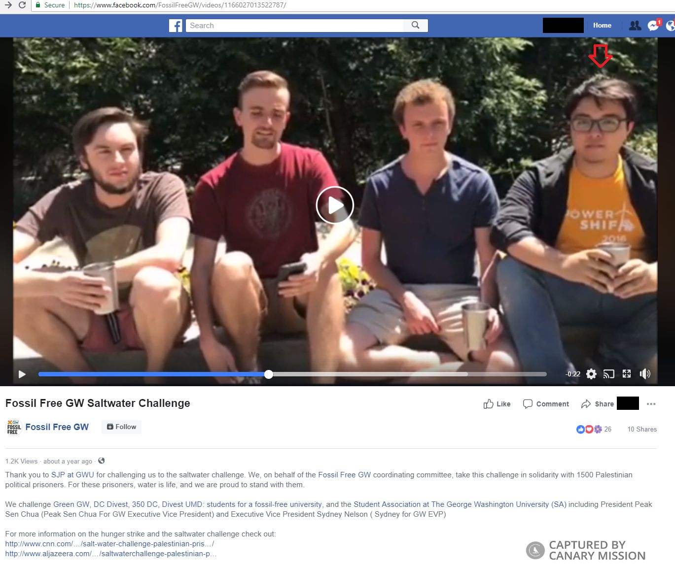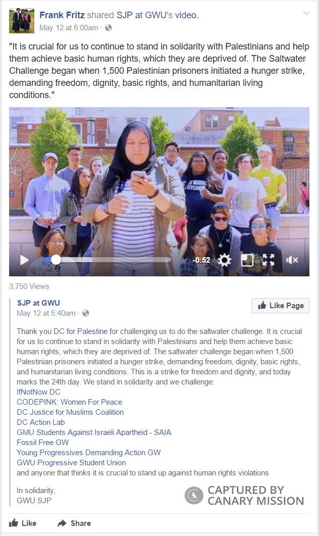 On May 12, 2017, Fritz appeared [00:00:01] in a Facebook video with fellow SJP at GWU activists participating in the “Saltwater Challenge” in support of Palestinian prisoners in Israeli jail. On the same day, he shared the video on his own Facebook page.BDS Activism
