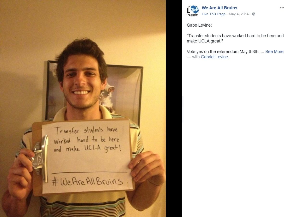 On November 4, 2014, Levine posted a graphic on his Facebook page in support of an SJP UCLA divestment resolution. The resolution, which was later endorsed by the UCLA student government, called on the University of California Board of Regents to divest from a list of companies allegedly tied to violence against Palestinians.