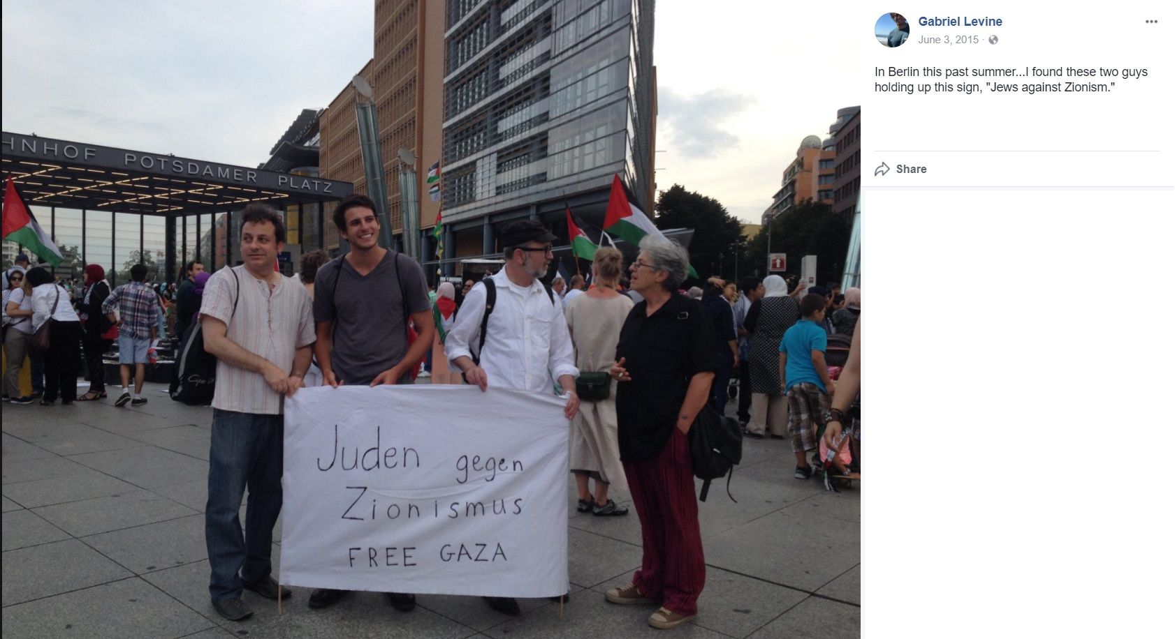 Levine is also a member of the Facebook group International Jewish Anti-Zionist Network (IJAN) and has spread hatred of Israel on social media.