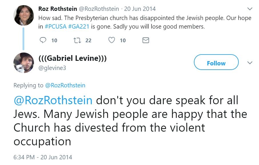 On June 20, 2014, Levine responded to a tweet which said: “How sad. The Presbyterian church has disappointed the Jewish people.” Levine said: “@RozRothstein don't you dare speak for all Jews. Many Jewish people are happy that the Church has divested from the violent occupation.”
