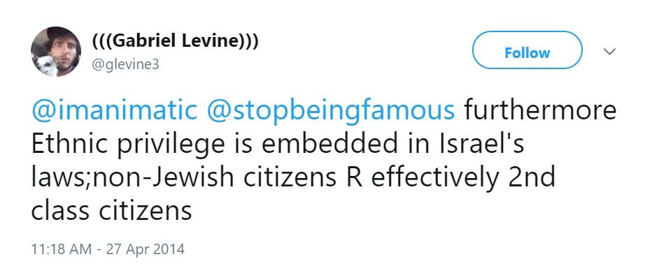 On April 27, 2014, Levine tweeted: “... Ethnic privilege is embedded in Israel's laws;non-Jewish citizens R effectively 2nd class citizens.”