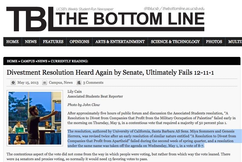 Genesis Herrera was active in the Boycott, Divestment and Sanctions (BDS) movement at the University of California Santa Barbara (UCSB). She was one of the authors and sponsors of a UCSB pro-divestment bill, which ultimately failed to pass.