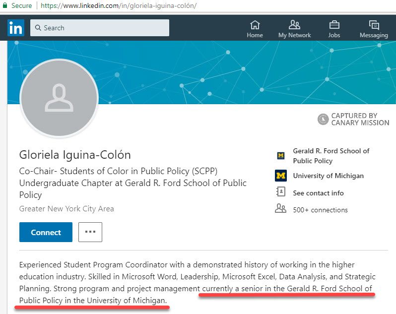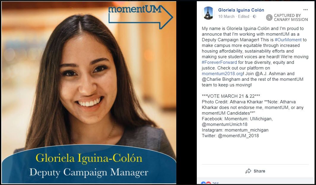 Gloriela Iguina Colon supported an anti-Israel Boycott, Divestment, Sanctions (BDS)resolution in the University of Michigan, Ann Arbor (UM Ann Arbor) Central Student Government (CSG), in 2017.As of April 2018, Colon’s LinkedIn page said she was the co-chair of Students of Color in Public Policy (SCPP) and was studying for her bachelor’s degree in Public Policy at UM Ann Arbor, from 2014-2018.
