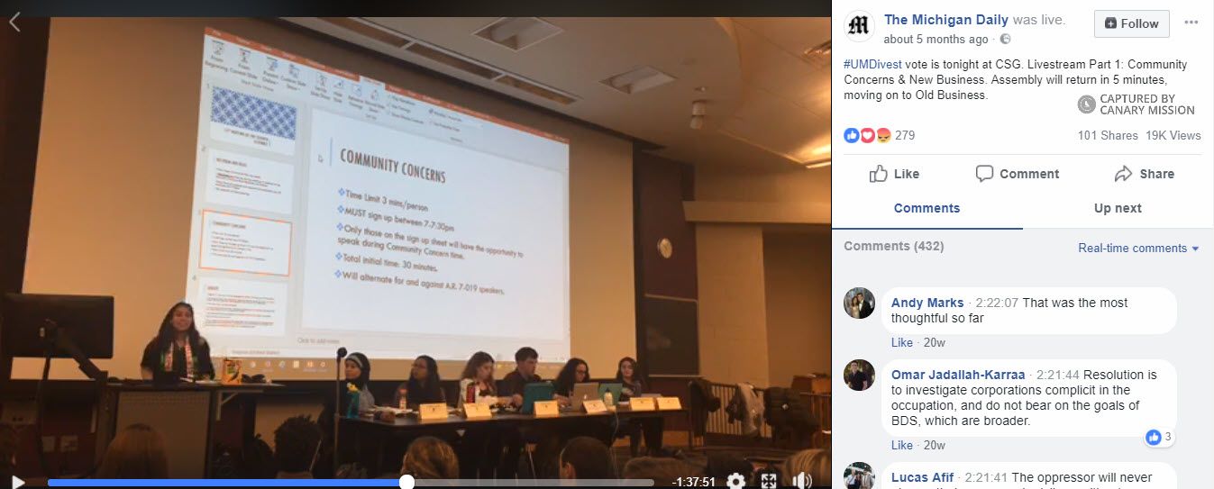 Reema Kaakarli, a SAFE activist, spent [00:53:32] nearly two minutes trying to distinguish UMDivest’s resolution from BDS and specified [00:54:28]: “We really want to distinguish ourselves from the leaders of the broader BDS movement.”
