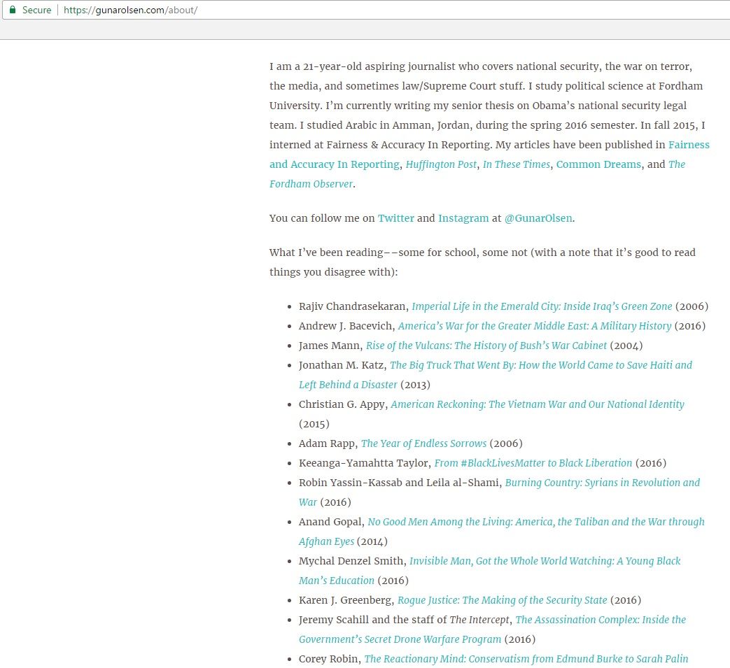 Olsen is an aspiring journalist, whose articles have been published in Fairness and Accuracy In Reporting, Huffington Post, In These Times, Common Dreams and The Fordham Observer.