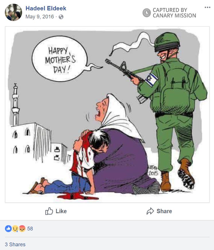 On May 9, 2016, Eldeek posted to Facebook a cartoon of a bleeding Palestinian child in his mother’s arms and a Israeli soldier, presumably having shot him, grinning while saying “Happy Mother’s Day.”