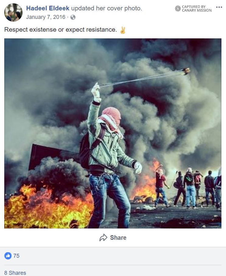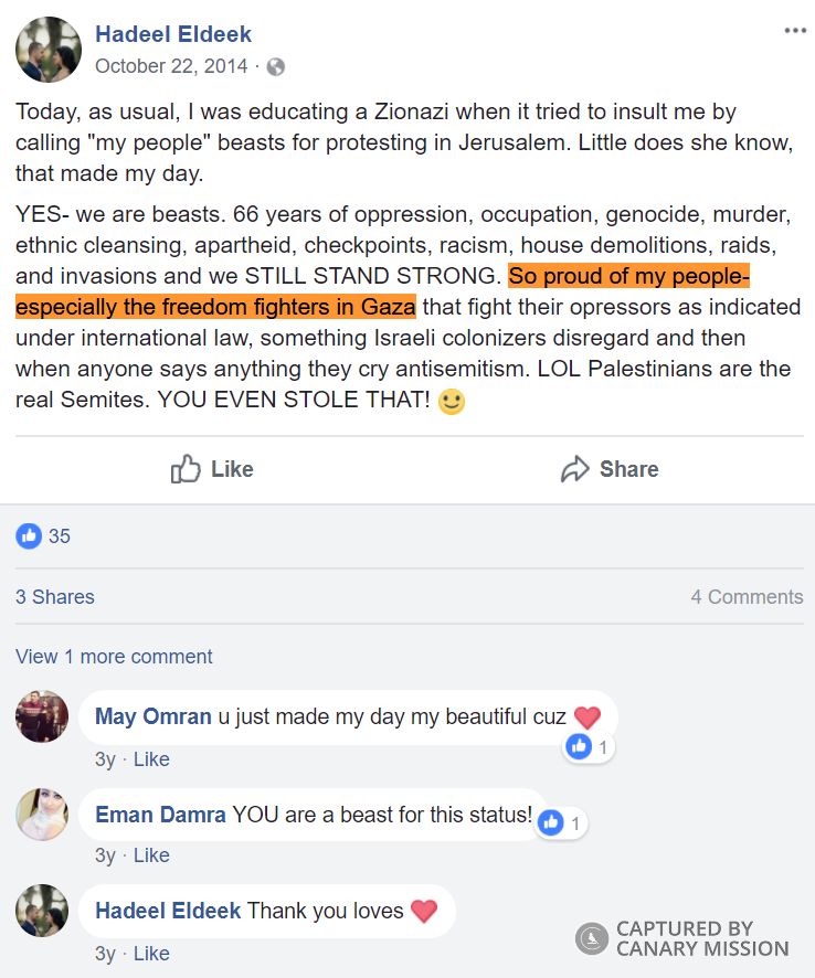 On August 29, 2016, Eldeek posted to Facebook a stock photo of two bedouin, one with a rifle, adding: “It's funny how they call us terrorists but we're just defending our land from their terrorist colonial invasion.