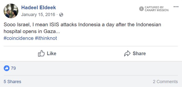 On January 15, 2016, Eldeek posted to Facebook: “Sooo Israel, I mean ISIS attacks Indonesia a day after the Indonesian hospital opens in Gaza... #coincidence #ithinknot.”