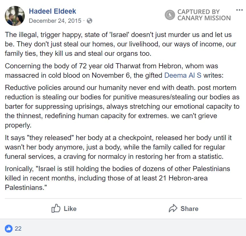 On December 24, 2015, Eldeek posted to Facebook “The illegal, trigger happy, state of 'Israel' doesn't just murder us and let us be. They don't just steal our homes, our livelihood, our ways of income, our family ties, they kill us and steal our organs too.”