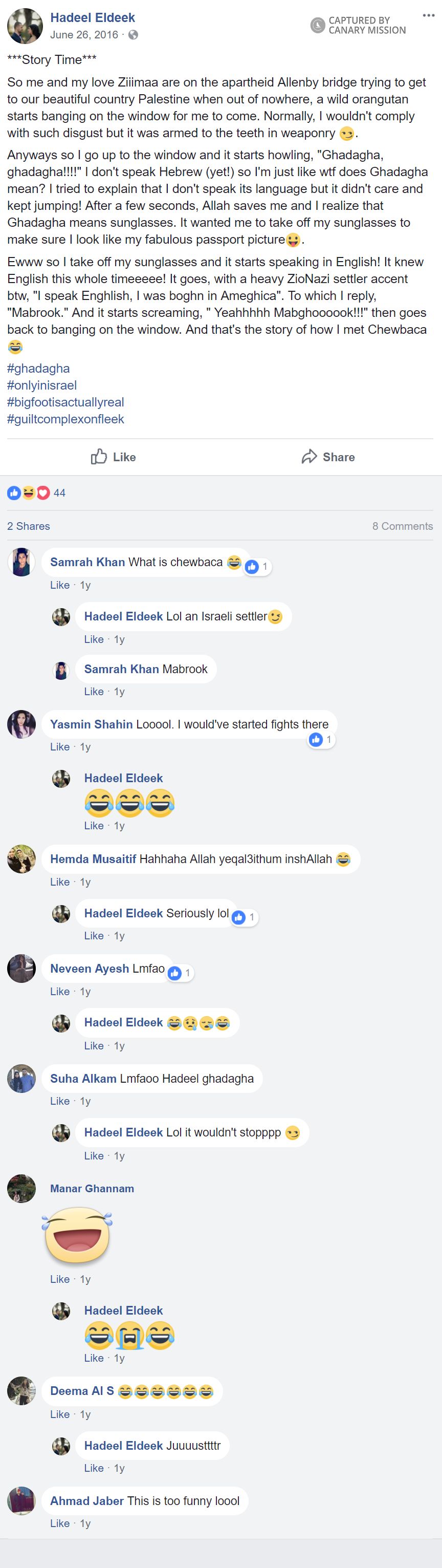 On June 26, 2016, Eldeek posted to Facebook a personal story headed ***story time***, where she referred to an Israeli soldier as a ”ZioNazi,” a “wild orangutan,” “chewbacca” and “bigfoot.”She wrote: “So me and my love Ziiimaa are on the apartheid Allenby bridge trying to get to our beautiful country Palestine when out of nowhere, a wild orangutan starts banging on the window for me to come.”